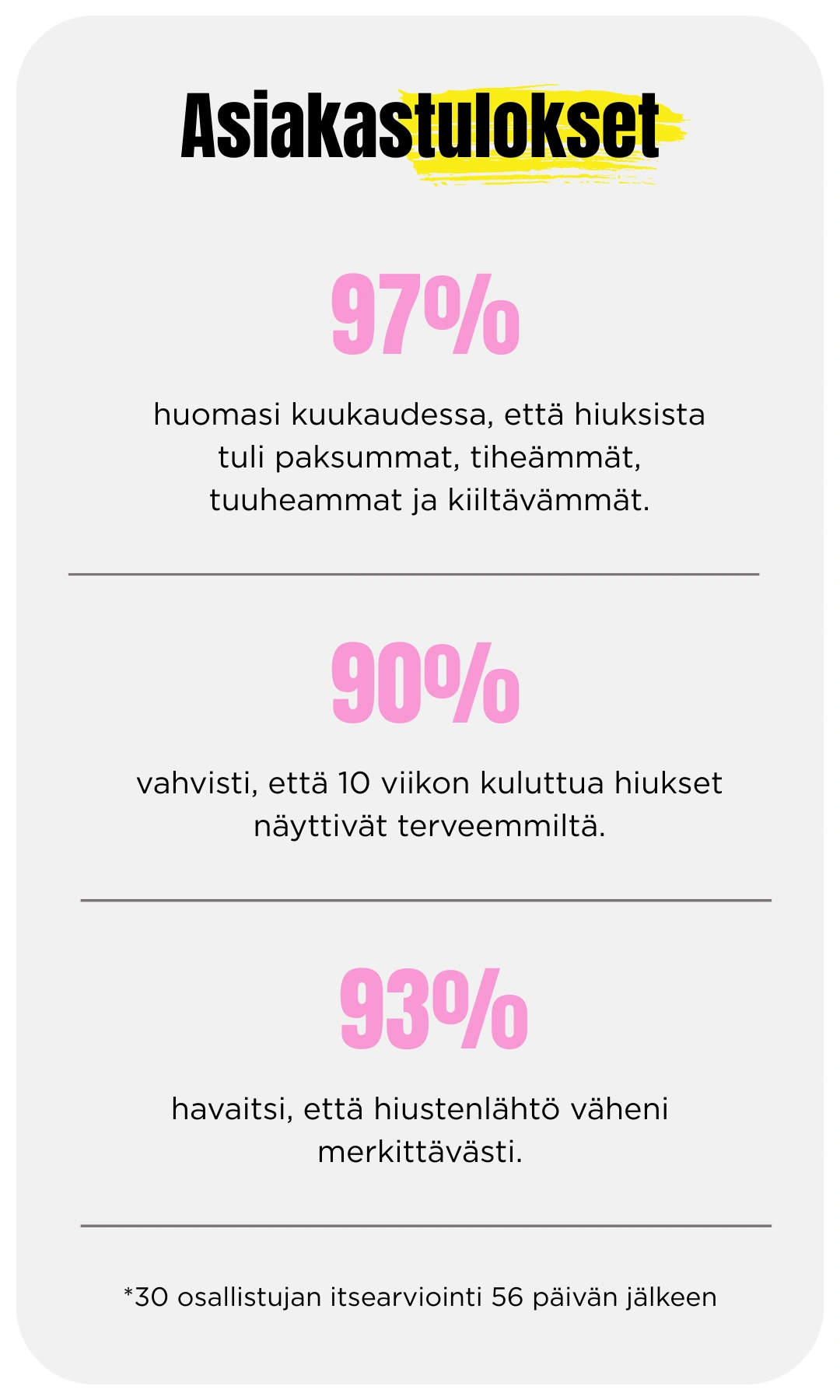 „ Hiustenlähtö on vähentynyt huomattavasti ja hiukset tuntuvat tuuheammilta 🤗 ”